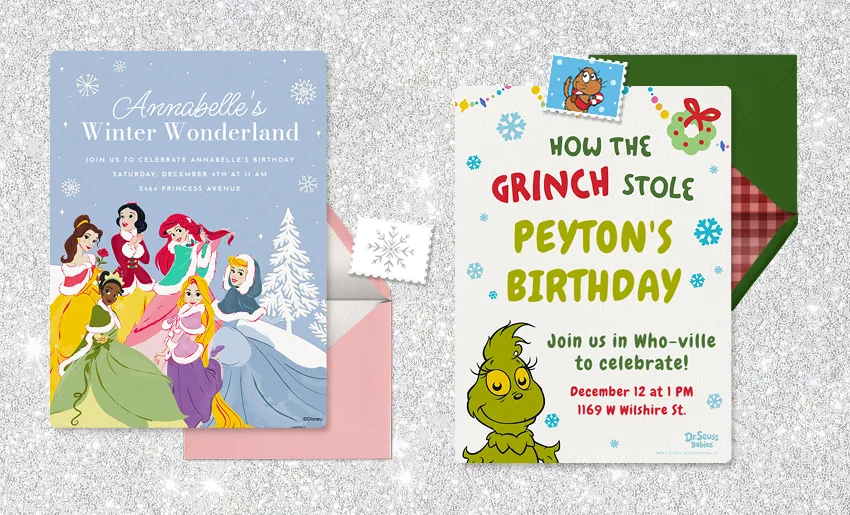 - The Grinch: Turn your home into Who-ville and screen your kid’s preferred version of How the Grinch Stole Christmas. Send the perfect Invitation to match!