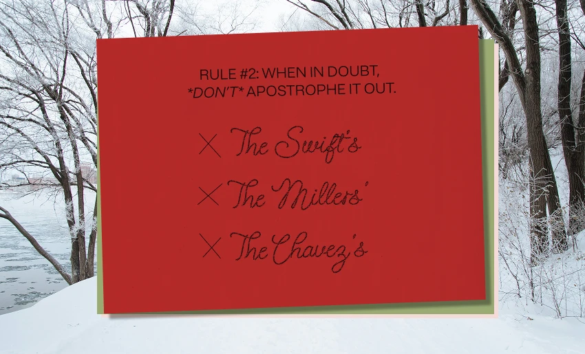 Fun fact… if you’re addressing a holiday card to a family or from your own, you never need an apostrophe (grammar nerd talk… that makes it “possessive” rather than plural).