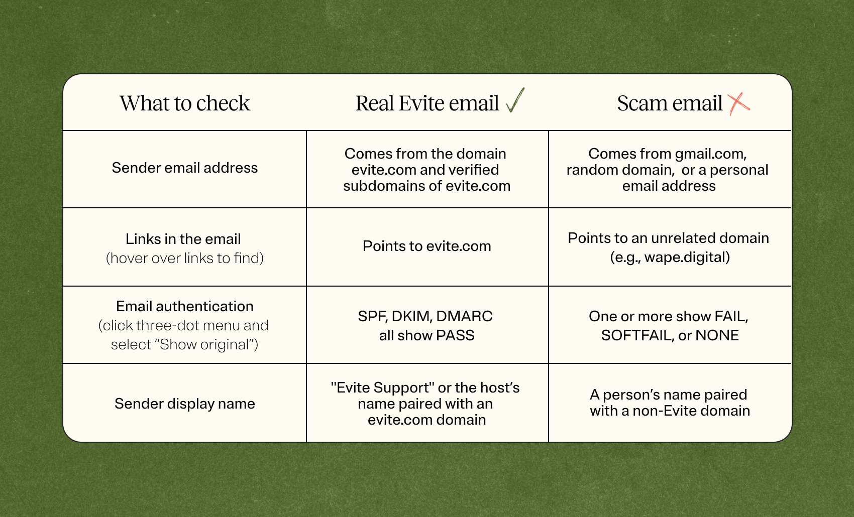 The good news: real Evite emails have clear, verifiable signals that distinguish them from fakes. Here’s how to spot them.