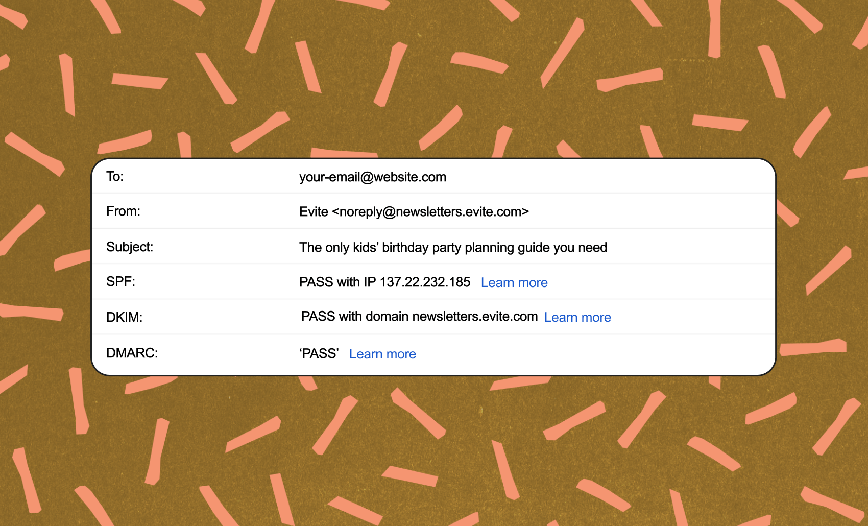 - Look for SPF, DKIM, and DMARC — all three should say “PASS” for legitimate Evite emails.