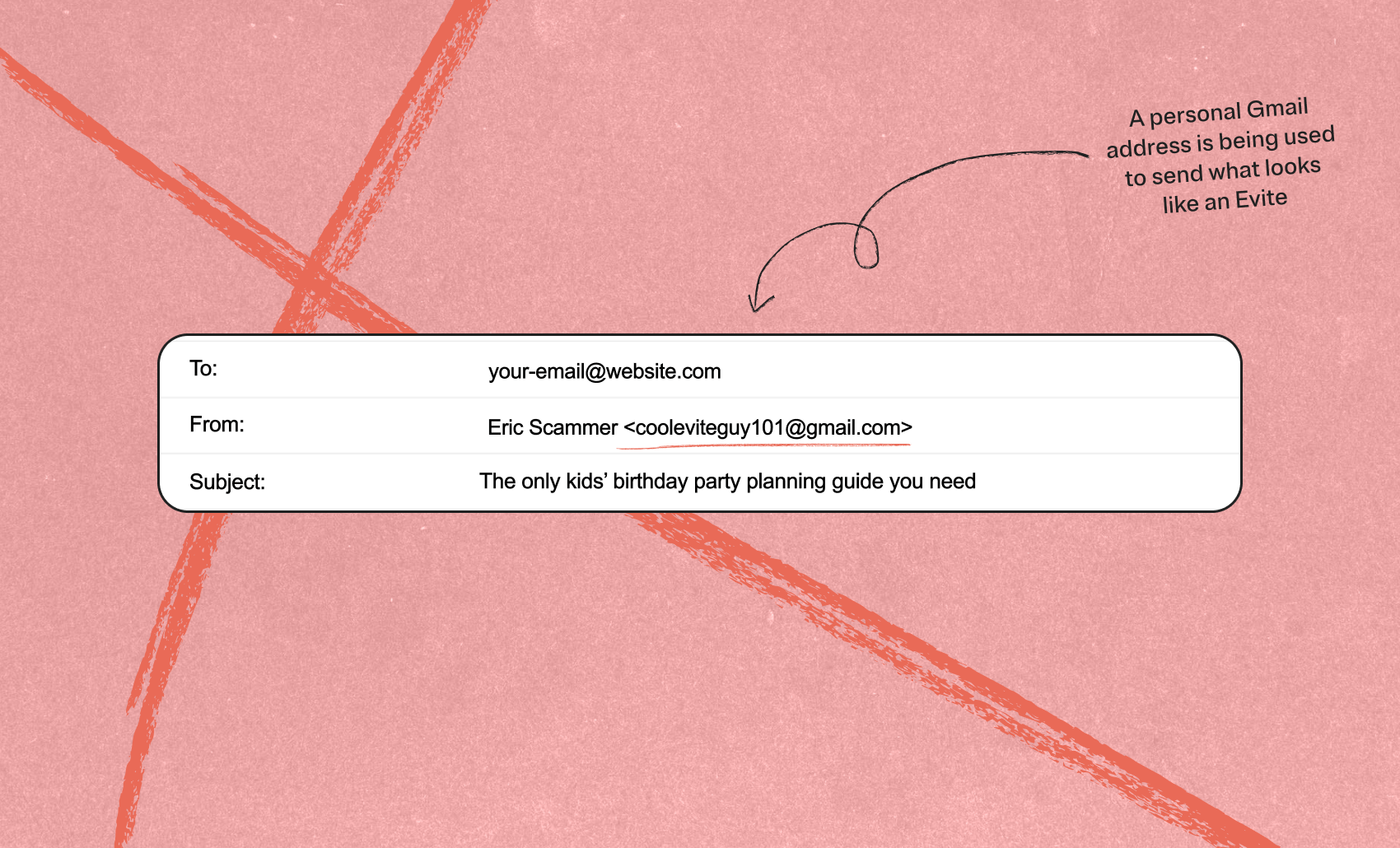 Phishing emails will sometimes use what look like personal email or Gmail addresses to send. This is a clear red flag. Evite will never send from a gmail.com, yahoo.com, hotmail.com, or any personal email address.