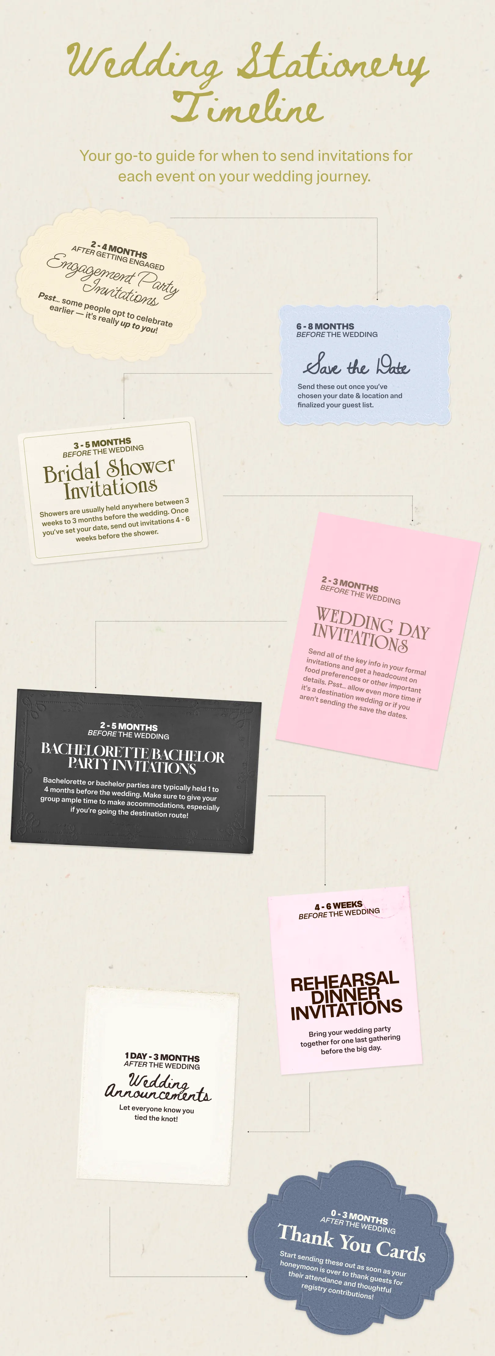 Start by taking a look at our wedding stationery timeline guide below to help you navigate wedding invitation etiquette. Then, keep reading to check out our answers to commonly asked questions and get top tips on choosing your Invitation style!