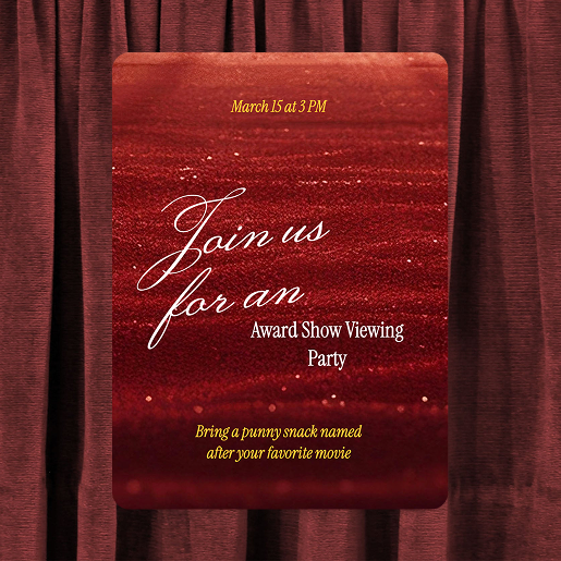 - Red carpet supper club: Roll out the red carpet and invite your guests to dress in their finest attire! “I had nowhere to wear this” parties are becoming increasingly popular, and the Oscars are the perfect occasion to invite everyone to break out the red carpet look they’ve had sitting in the back of their closet.