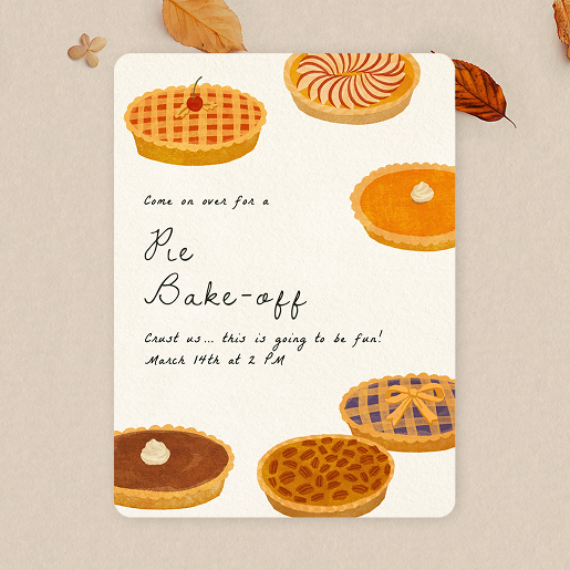 - Sweet as pi: No surprise here, we’re all about the pie. Plan a “Pi Potluck” where everyone brings a delicious pastry to share. Don’t forget to use the event sign-ups section on your Evite to let guests sign up for the type of pie they’re bringing, so you don’t end up with seven pumpkin ones!