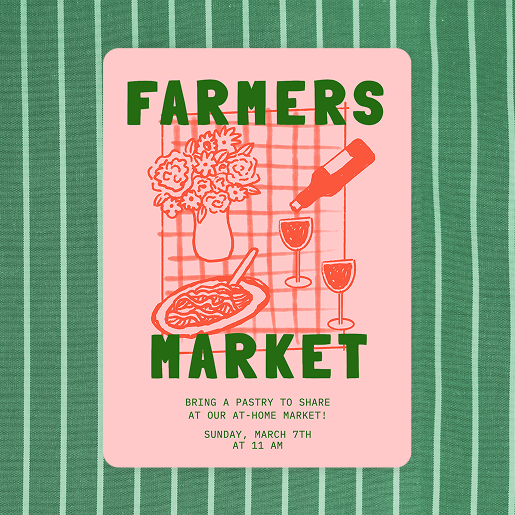 - At-home farmers market: Spring is a prime time for farmers market goodness! Celebrate the season by inviting friends to bring their own “farmers market item” (a pastry or any other creation) to set up on a table that all your guests can “shop” from.