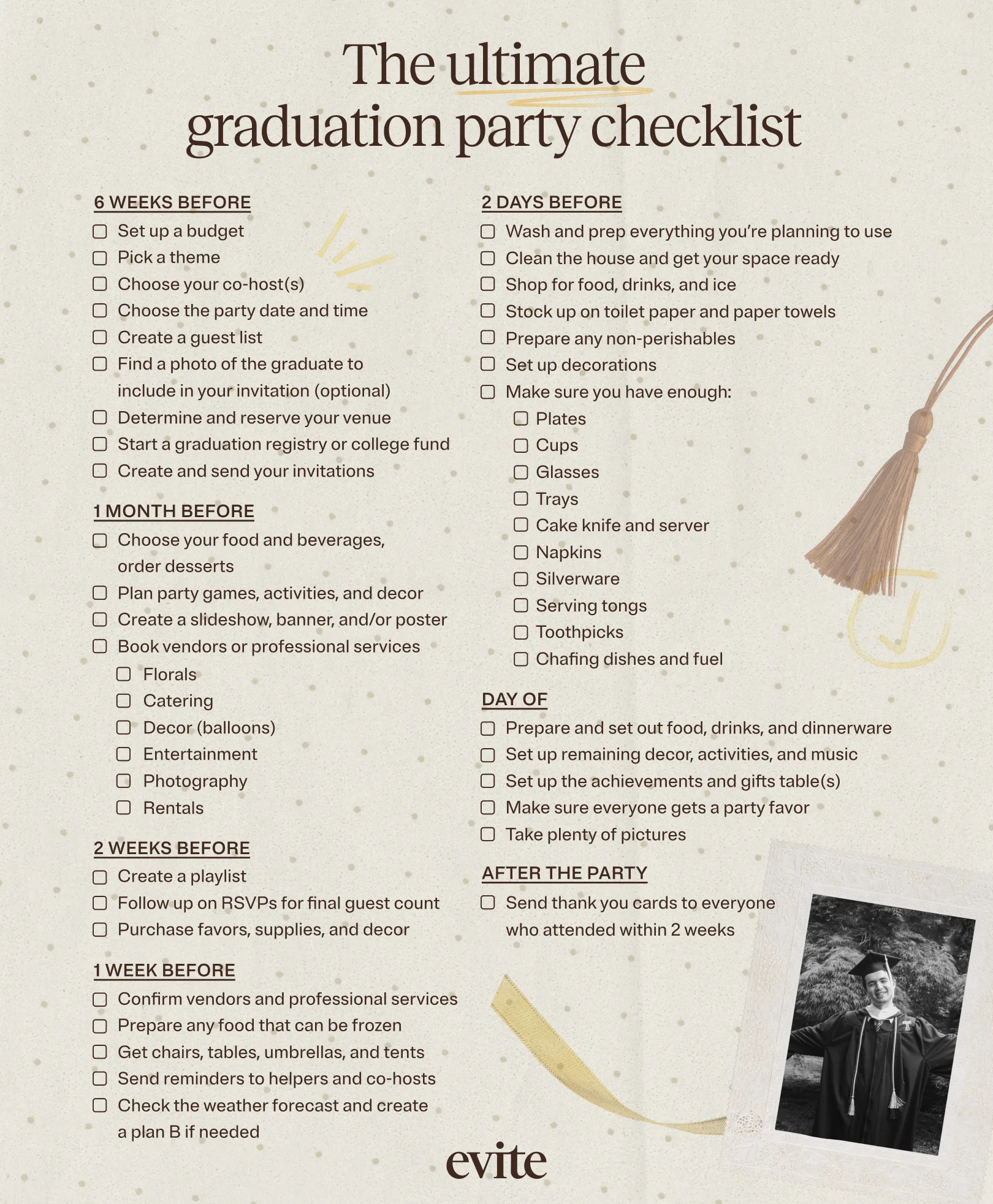 Every party is different, so no! This graduation party checklist is designed to cover the most common timeline for graduation party planning. We're here to map out a list of to-dos you might want to be reminded of, but if something doesn’t fit with your plans, adjust it to suit YOUR party!