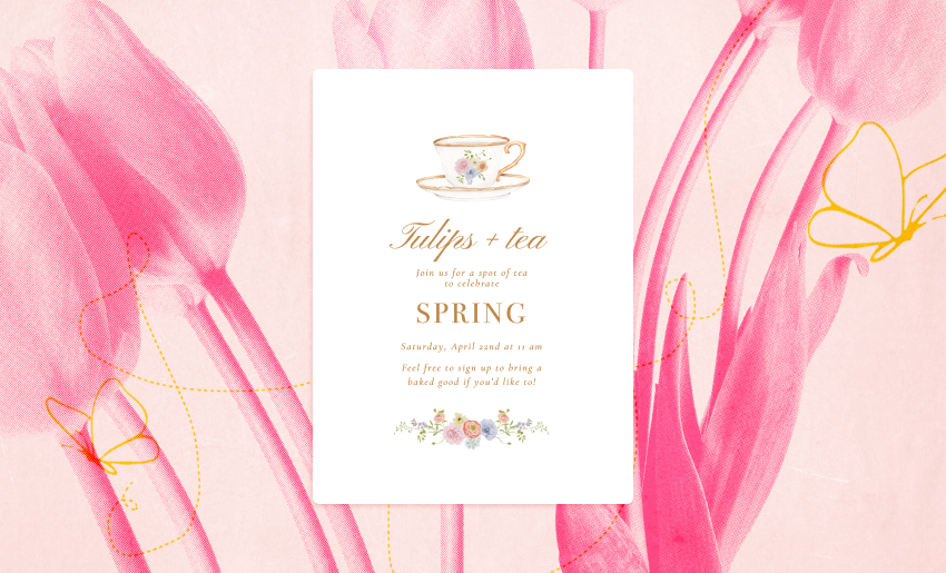 - The menu: Go full Ina Garten on this one – we’re thinking pear gallettes, quiche, and even crumpets and jam. The fresher, the better. Mix up a big salad with lots of halved cherry tomatoes and lemon, and invite your guests to bring their favorite spring dish to make it a potluck! You can even ask people to sign up for specific food categories to be sure you have the right amount of everything. (Did you know Evite has a built-in event sign-ups feature that you can put right into your Invitation? Now you do.)