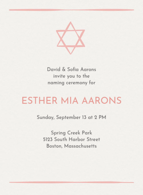 Browse Evite's collection of Invitations for your baby naming or bris. Select and customize the perfect design to easily send to all of your guests via text or email.