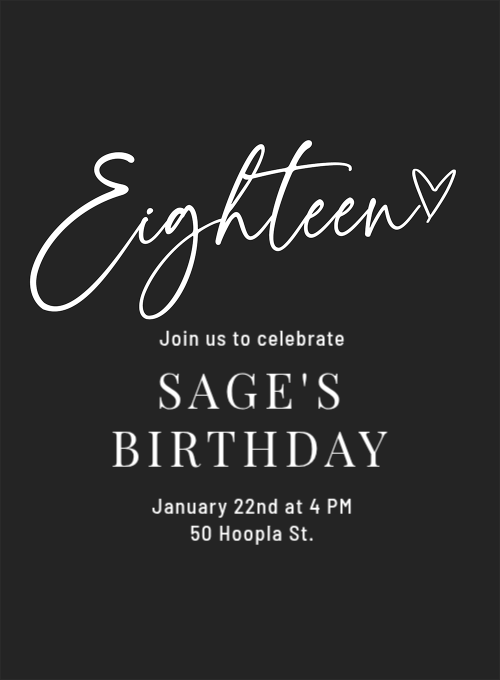 Welcome to 18! Ring in adulthood with a custom Invitation you can personalize and send via text or email.