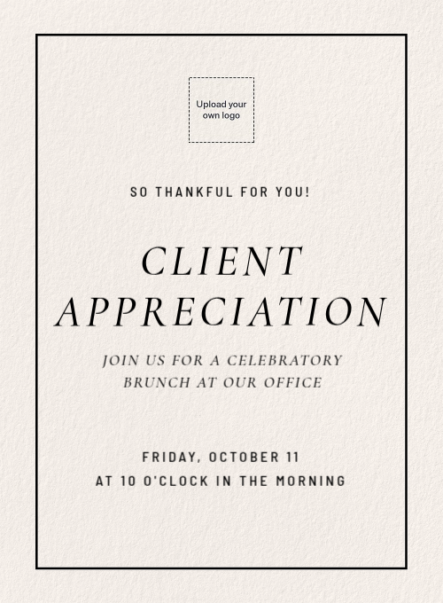 Create a custom Invitation for your brand or business in just a few clicks. Add your logo, enter your event details, and make a lasting impression on clients and guests!