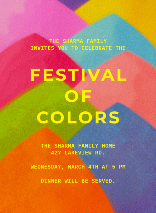 Holi is on Wednesday, March 4, 2026! Browse Evite's collection of Holi invitations, then easily select and customize your invite and send it via text or email.