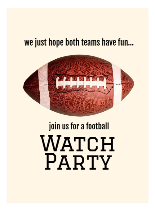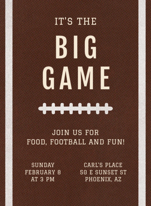 Score major points with your guests thanks to Evite's collection of football Invitations. Easily select and customize the perfect Football Party Invitation (including one for the big game)!
