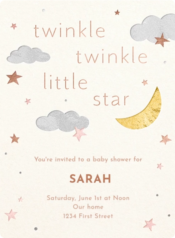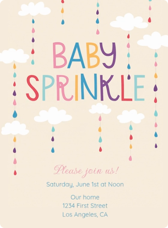 Baby shower etiquette is different for everyone. Some people prefer to host a low-key baby sprinkle where guests come and go, while others wait until after the baby is born to have a sip-and-see party. If you're having another type of shower to celebrate your parenthood journey, like an IVF shower, egg shower, adoption shower, or rainbow baby shower, you can also mention this in your invitation. Regardless of the type of party you throw, the invitations should include similar information. A baby shower invitation should include the essential information guests need about the event, as well as the parent's name. This consists of the event date, the time it starts, the location, and RSVP information. A baby shower invite can also include details about the gift registry and dress code if there is one. Evite's baby shower invitations offer hosts the option to add up to 3 registries or a baby fund right to their event to make gifting extra easy for guests.