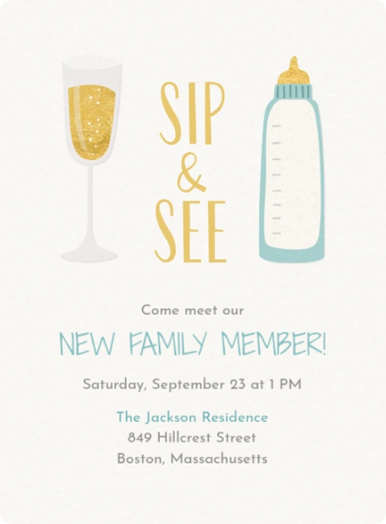 - After the baby's arrival: With our post-arrival invitations like our 100 Days Celebration Invitations, Sip & See Invitations, and First Birthday Invitations, you can find everything you’re looking for to celebrate the arrival of the new child!