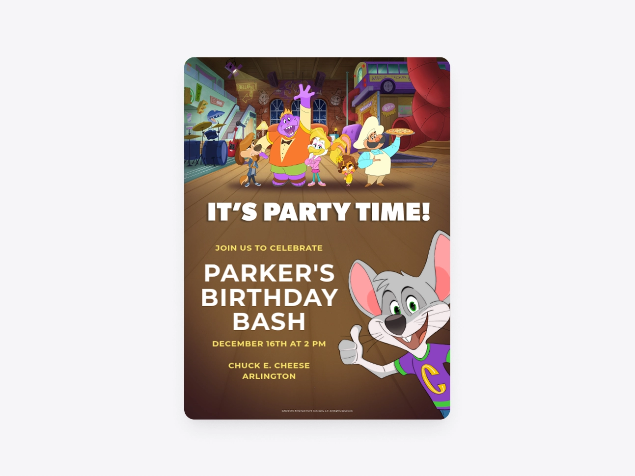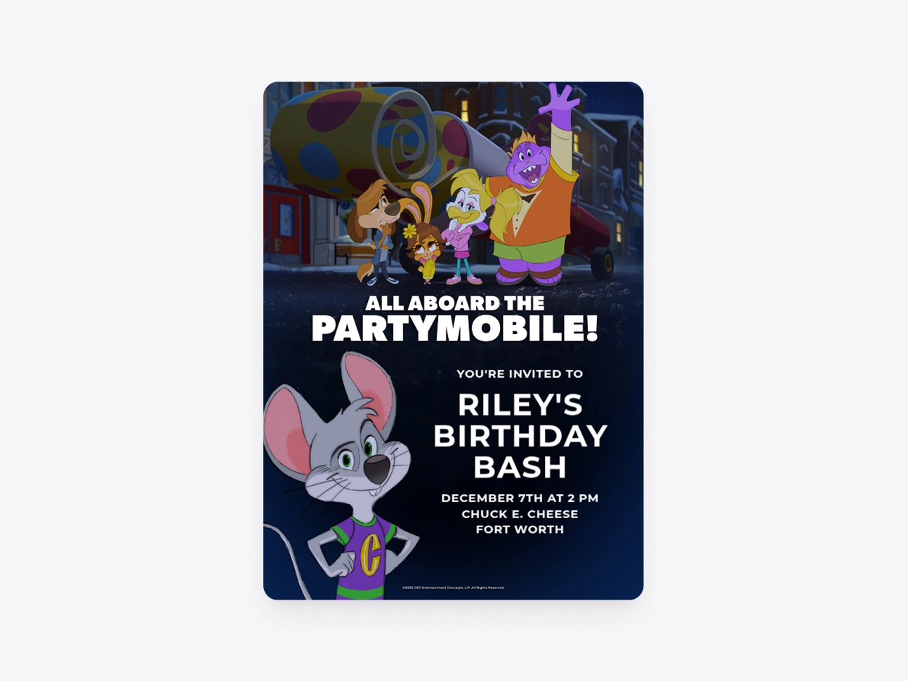 Hop aboard the Partymobile, and celebrate in style with Chuck E. and the band!